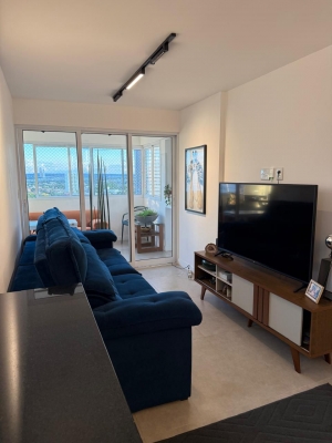 Apartamento com tela de proteção, iluminação completa, balcão americano em granito e portas de correr com três lâminas, integrando a sala de estar à área gourmet.